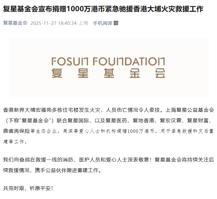 ?11月26日,香港新界大埔區宏福苑發生火災,造成重大人員傷亡。災情牽動全體中國同胞的心,滬上民營企業紛紛伸出援手,馳援香港大埔災后救援。