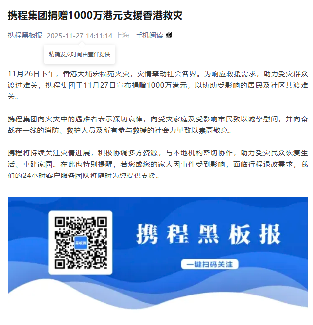 攜程集團捐贈1000萬港元,以協助受影響的居民和社區共渡難關。
