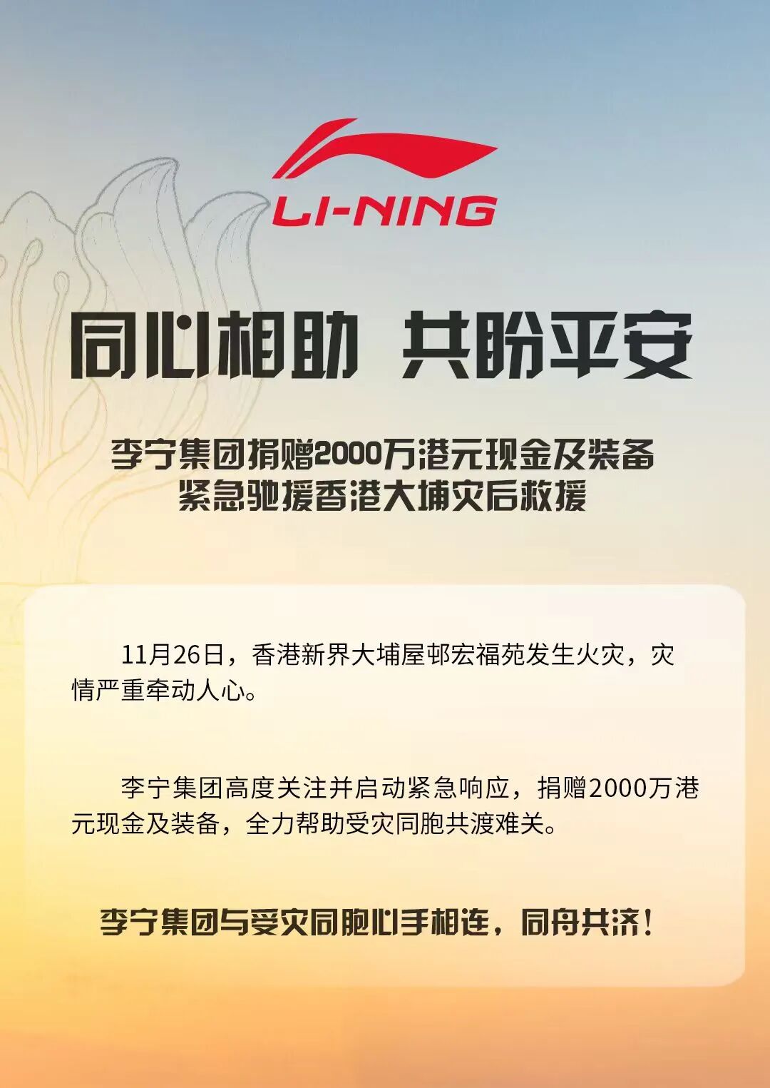 李寧集團捐贈價值2000萬港元現金及裝備,馳援災后救援工作。
