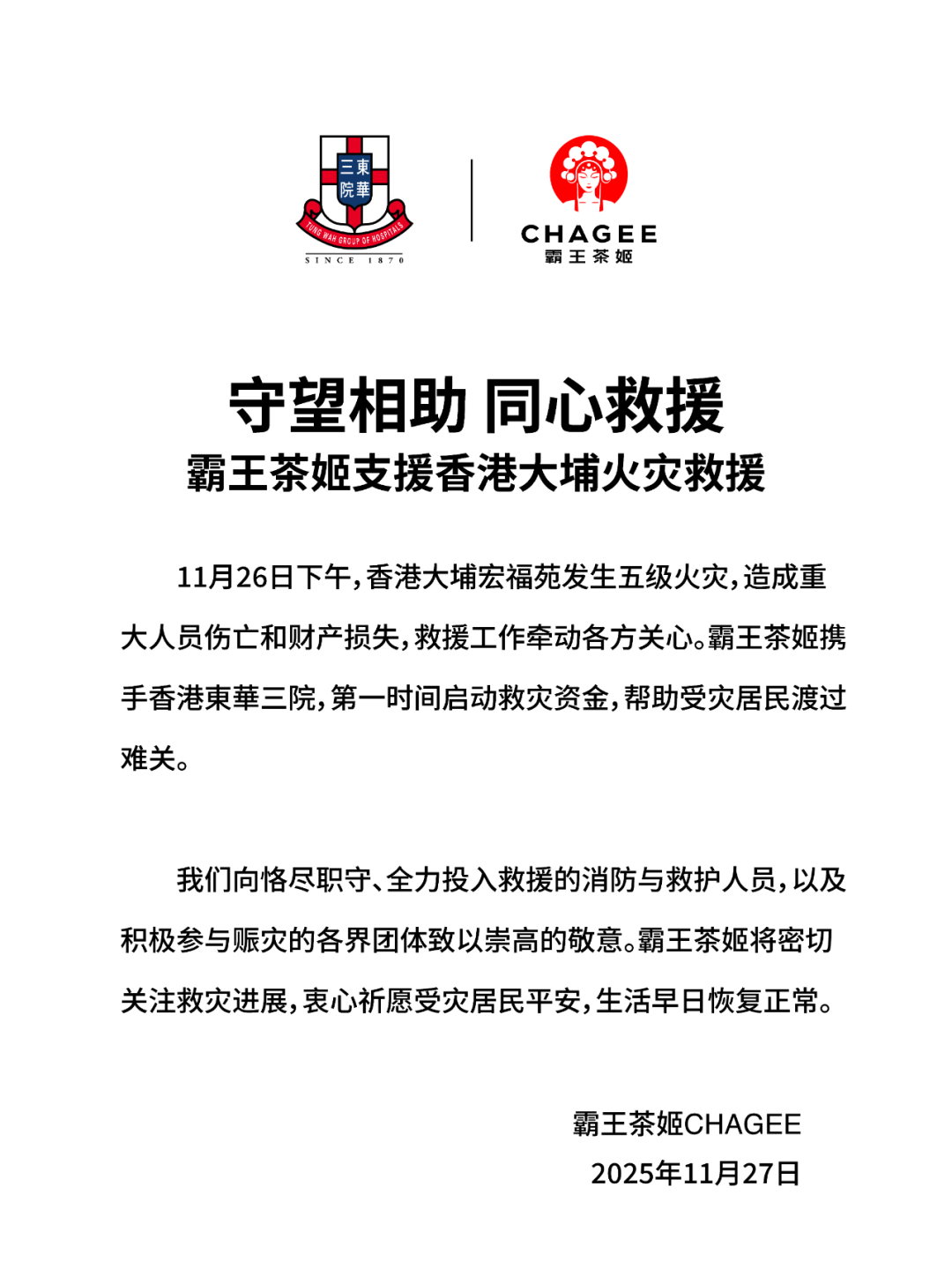 霸王茶姬攜手香港東華三院,啟動救災資金,幫助受災居民渡過難關。
