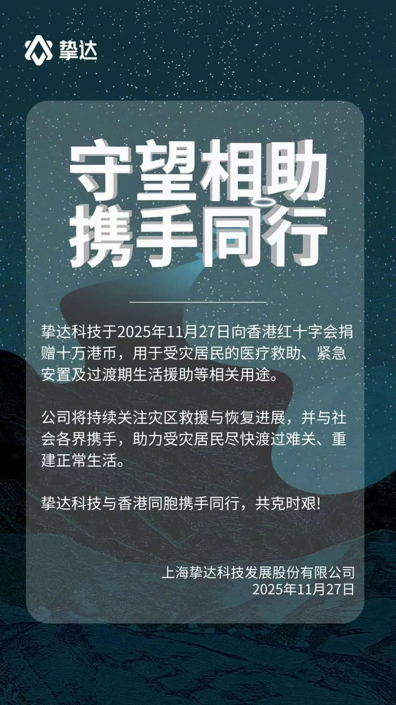 摯達科技向香港紅十字會捐贈10萬港元,用于受災居民的醫療救助、緊急安置及過渡期生活援助等相關用途。