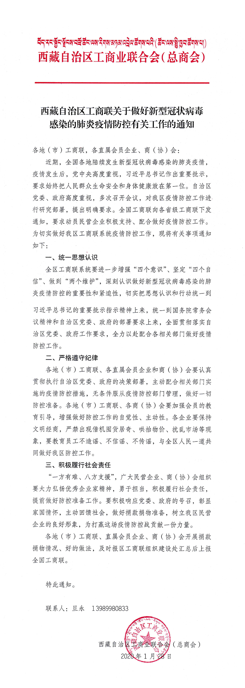 西藏自治區(qū)工商聯(lián):關(guān)于做好新型冠狀病毒感染的肺炎疫情防控有關(guān)工作的通知