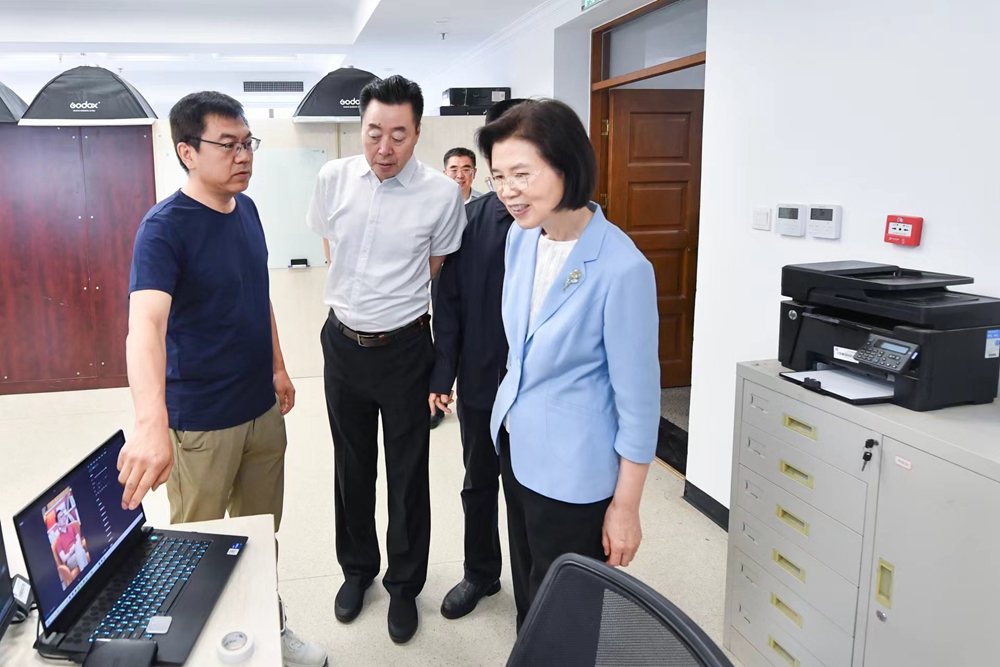 7月12日上午,中央統戰部副部長、全國工商聯黨組書記沈瑩到中華工商時報社、全國工商聯商會發展服務中心、中國民營經濟研究會等直屬單位走訪調研。這是沈瑩在報社新媒體部了解新媒體產品制作情況。張雷/攝