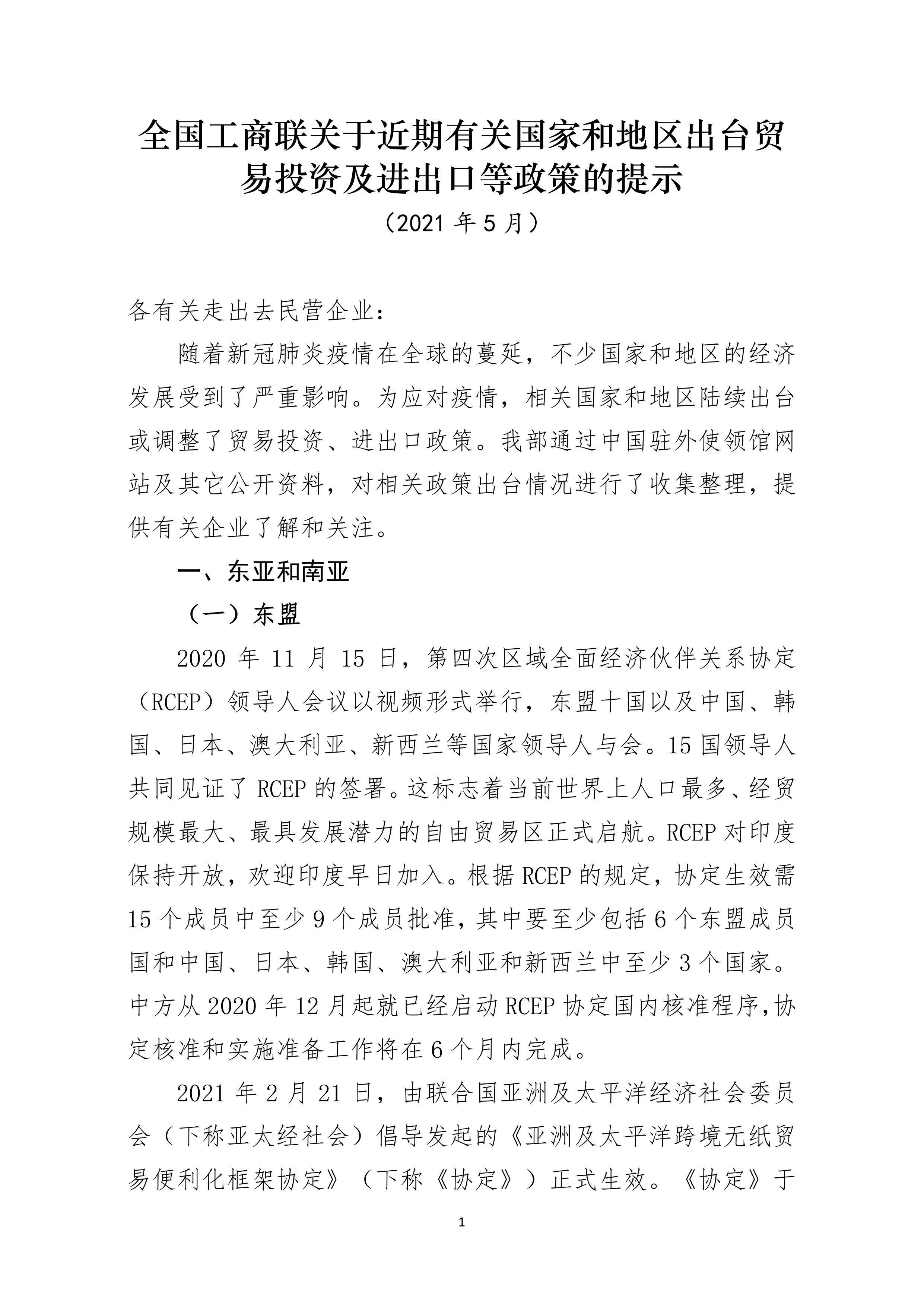 全國工商聯關于近期有關國家和地區出臺貿易投資及進出口等政策的提示