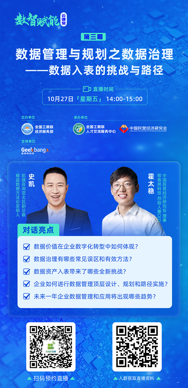 10月27日14:00-15:00,“數智賦能云課堂”第3期直播將圍繞“數據管理與規劃之數據治理”主題,邀請中國民營經濟研究會理事、極客邦科技創始人兼CEO霍太穩與凱捷咨詢亞太區副總裁、精益數據方法論發明人史凱進行對話,深入探討數據價值在企業數字化轉型中如何體現,數據資產入表帶來的全新挑戰,以及企業如何進行數據管理頂層設計、規劃和路徑實施。