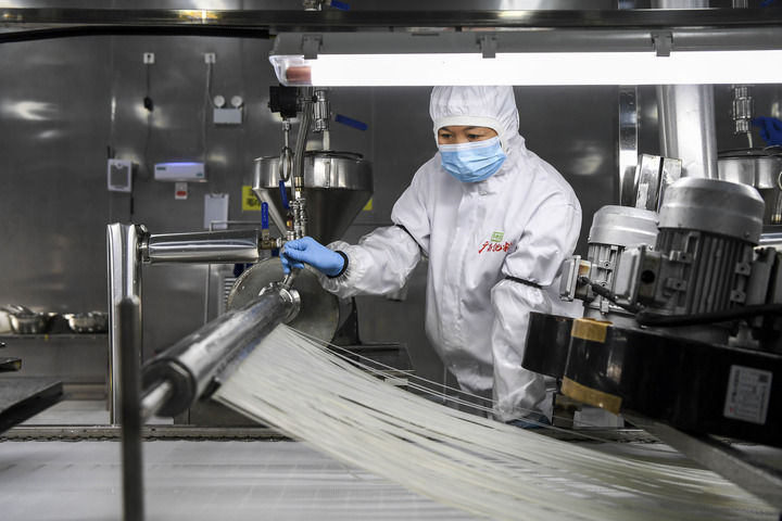 ??在廣西柳州市一家螺螄粉生產(chǎn)企業(yè),工作人員在查看米粉的生產(chǎn)情況(2024年12月13日攝)。新華社記者 曹祎銘 攝