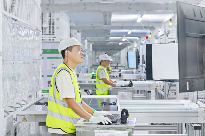 ??工人在位于浙江省樂清市的正泰集團(tuán)8GW高效光伏組件生產(chǎn)基地工作(資料照片)。新華社發(fā)