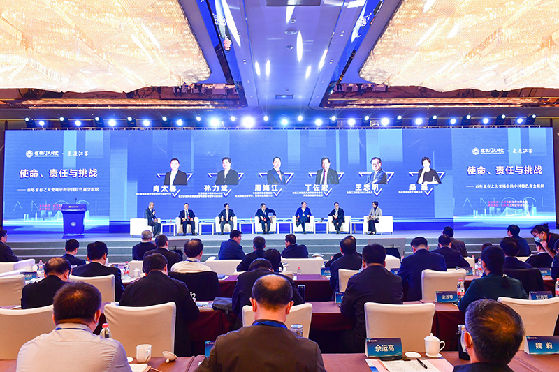 論壇對話環節,中國民間商會副會長、紅豆集團董事局主席兼CEO周海江,全國工商聯家具裝飾業商會會長、月星集團董事局主席丁佐宏,江蘇省數字經濟商會會長、南京聯創科技集團股份有限公司董事長兼總裁孫力斌,浙江省湖北商會常務副會長兼秘書長肖太春,江蘇省常州市武進區工商聯主席桑遙以及點評嘉賓全國工商聯智庫委員會委員王忠明圍繞商會在國內國際雙循環相互促進的新發展格局中如何適應經濟形勢對商會建設帶來的新挑戰,不斷加強自身建設、協同參與社會治理、積極做好新時代民營經濟統戰工作等內容進行探討交流。