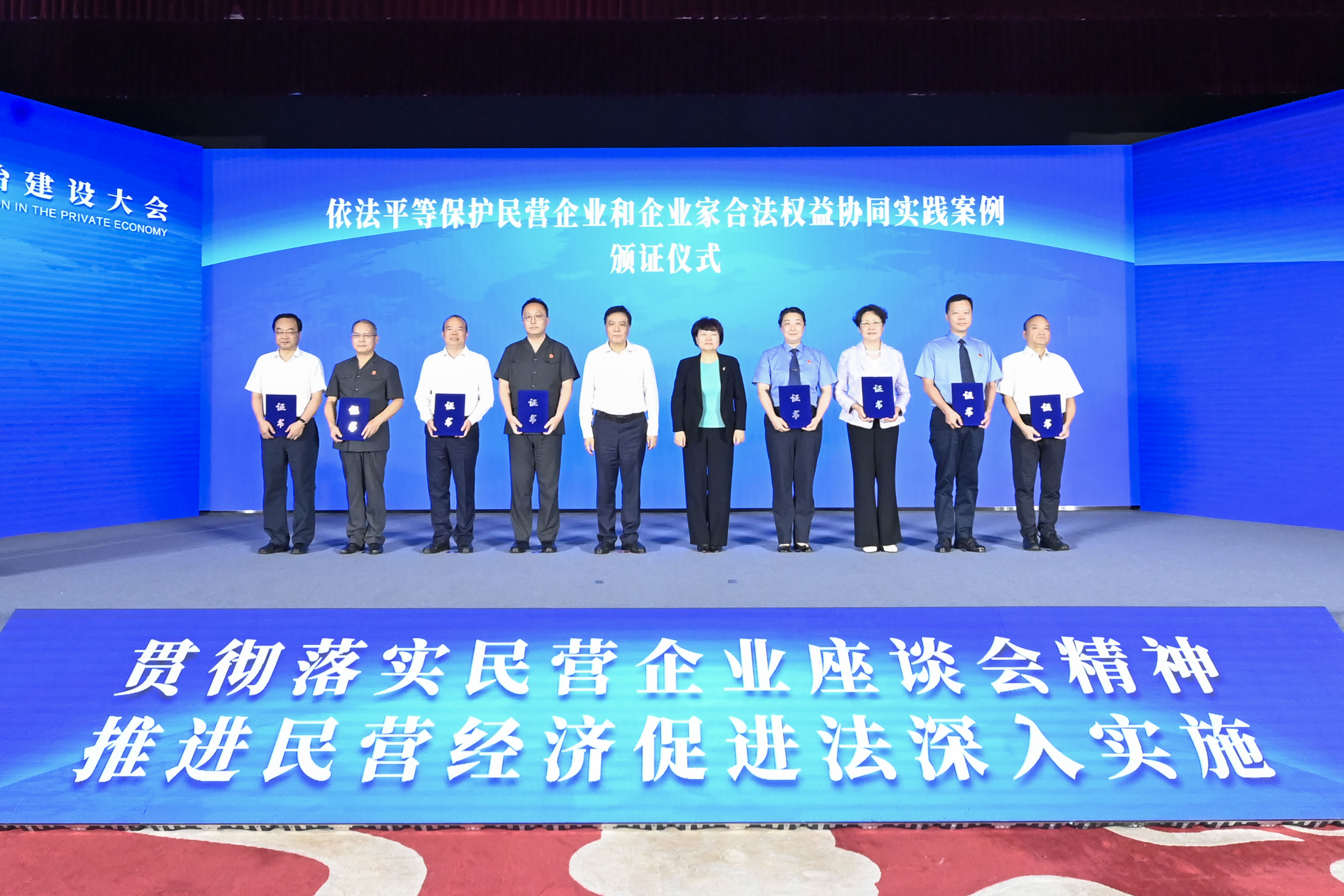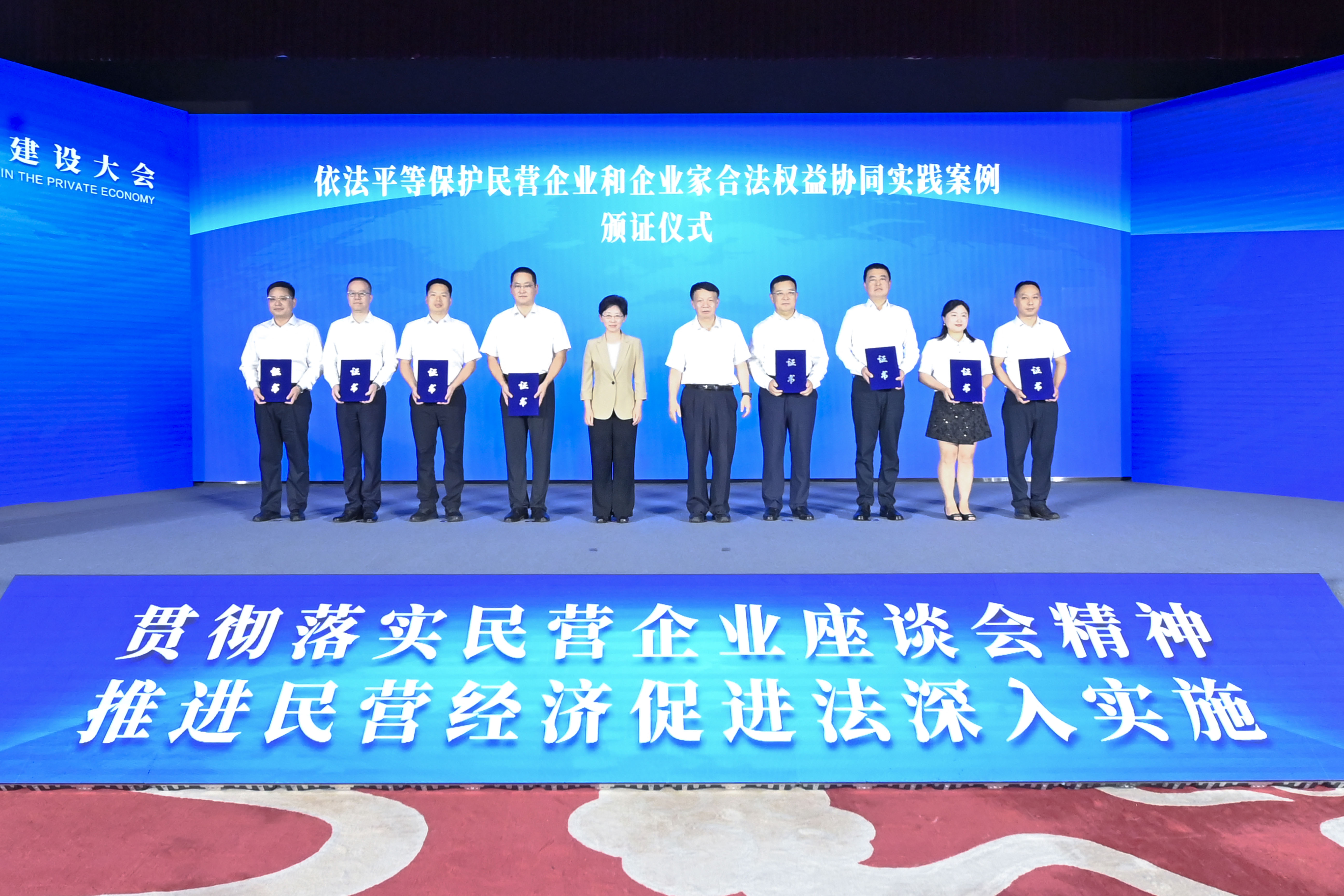 大會展示了最高人民法院、最高人民檢察院、司法部、中國法學會和全國工商聯深入學習貫徹習近平總書記在民營企業座談會上的重要講話精神,扎扎實實落實各項政策法規,以高質量法治護航民營經濟高質量發展的生動實踐,發布了2025推進民營經濟法治建設十大實事,依法平等保護民營企業和企業家合法權益系列典型案例,依法平等保護民營經濟合法權益研究報告(2025)及依法平等保護民營企業和企業家合法權益協同實踐案例,《法治民企行動方案(2021—2025年)》落實情況報告及商會、民營企業推進法治民企建設典型做法,舉行了協同實踐案例單位代表頒證儀式。全國工商聯咨詢委員會委員、浙江傳化集團有限公司董事長徐冠巨宣讀了“完善企業治理 堅定走高質量發展之路——建立完善中國特色現代企業制度”倡議書,全國工商聯副主席、安踏集團董事局主席丁世忠,中國民間商會副會長、小米科技有限責任公司董事長雷軍圍繞學習總書記重要講話精神和民營經濟促進法作交流發言。