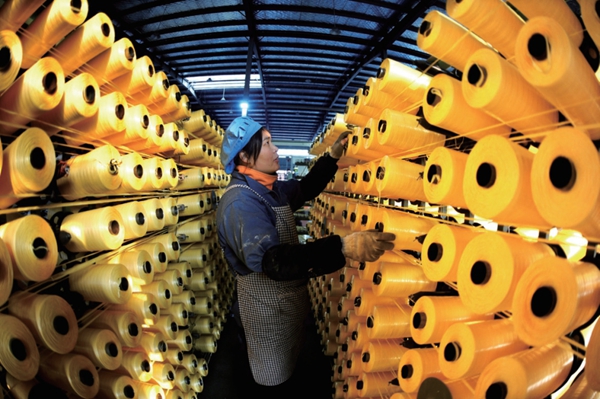 2025年2月21日,在江蘇省連云港市連云區(qū)一家民營編織袋企業(yè)車間內(nèi),工人在生產(chǎn)線上忙碌。