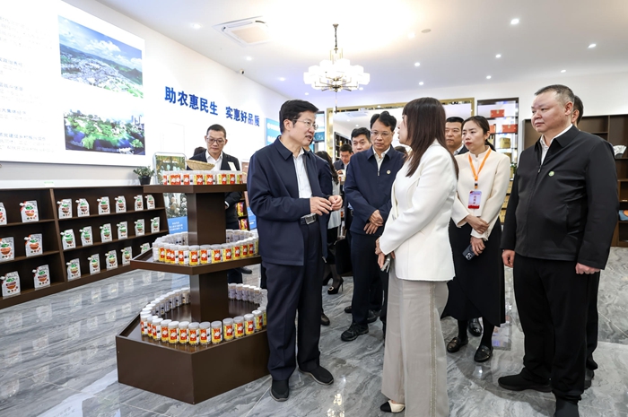 高云龍一行先后前往烏蒙利民生態茶場、百縣百品織金品牌館實地考察,現場察看項目聯農惠農情況,并召開專題座談會,認真聽取意見建議,深入了解織金縣鞏固拓展脫貧攻堅成果同鄉村振興有效銜接工作成效。