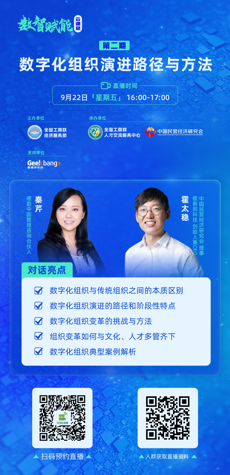 9月22日 16:00-17:00,第2期“數(shù)智賦能云課堂”將圍繞“數(shù)字化組織演進(jìn)路徑與方法”主題,邀請(qǐng)中國(guó)民營(yíng)經(jīng)濟(jì)研究會(huì)理事、極客邦科技創(chuàng)始人兼CEO霍太穩(wěn)與德勤中國(guó)管理咨詢合伙人秦芹進(jìn)行對(duì)話,深入探討企業(yè)組織變革的驅(qū)動(dòng)力、數(shù)字化組織與傳統(tǒng)組織模式的本質(zhì)區(qū)別、數(shù)字化組織的階段性特點(diǎn)以及組織變革過(guò)程中的挑戰(zhàn)和路徑探索。