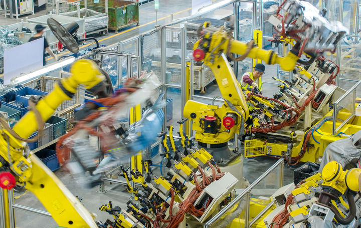 2025年10月9日,浙江省湖州市長興經濟技術開發區一家汽車部件有限公司的技術人員操控工業機器人生產新能源汽車配件(無人機照片)。新華社發(譚云俸攝)