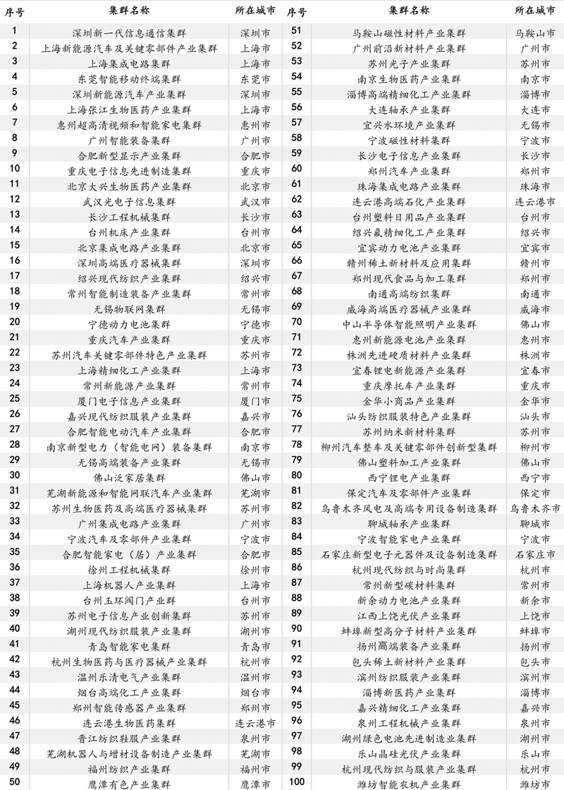 “2023中國百強產業集群”以2000多個產業集群為對象,設定了五個入門標準:主導產業為制造業及其細分領域;集群產值不低于300億人民幣;集群企業數量不少于3000家;民營企業貢獻率不低于80%;三年內無重大生產安全、產品質量、環境污染事故。在上述入選標準上,從創新能力、發展潛力、聚集程度、綠色水平等4個維度、8個子項,設計25個評價指標,并賦予權重,開展定量評價。最終評選出深圳新一代信息通信集群、上海新能源汽車及關鍵零部件產業集群、上海集成電路集群等100個產業集群。