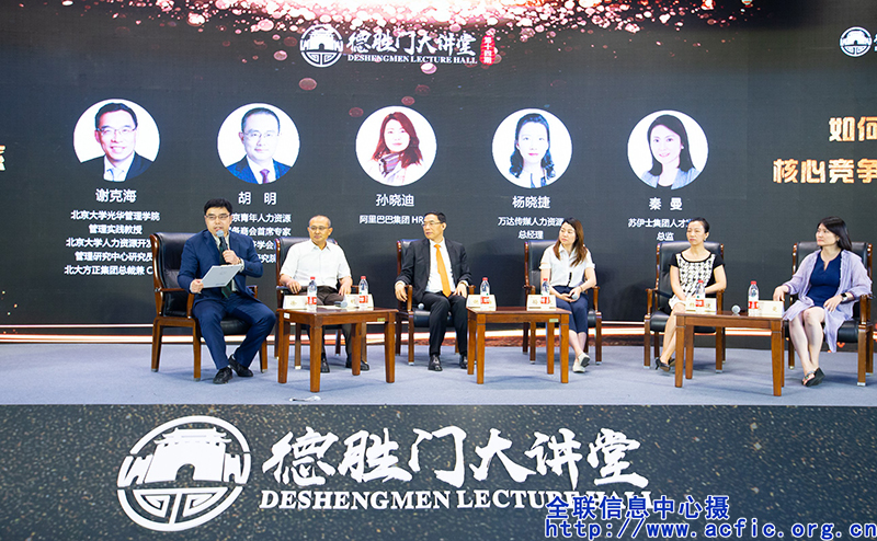 北大方正集團總裁兼CEO謝克海,北京青年人力資源服務商會首席專家、中國勞動經濟學會副秘書長、中國人力資本研究院執行會長胡明,阿里巴巴集團HRD孫曉迪,萬達傳媒人力資源總經理楊曉捷,蘇伊士集團人才發展總監秦曼圍繞“不忘初心、牢記使命,在中華民族偉大復興征程中如何構建具有核心競爭力的人才體系”等進行對話,研討交流。
