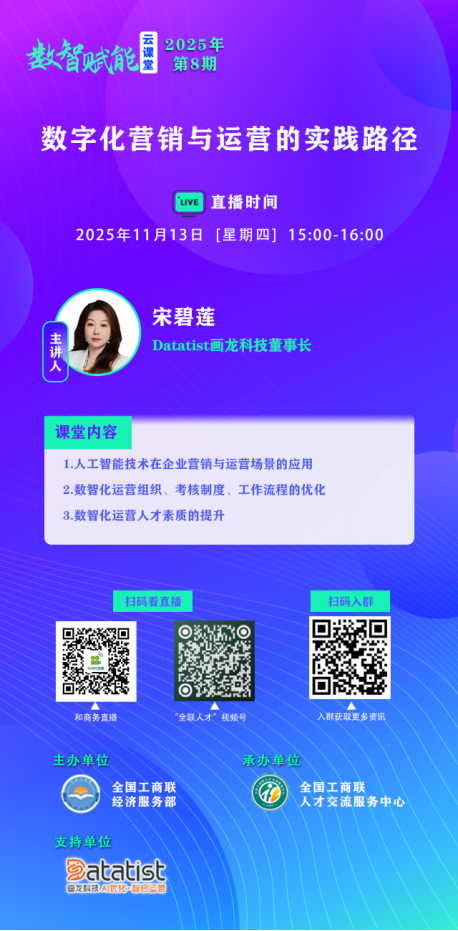 由全國工商聯經濟服務部主辦,全國工商聯人才交流服務中心承辦的2025年“數智賦能云課堂”第8期將于11月13日15:00-16:00正式開播。