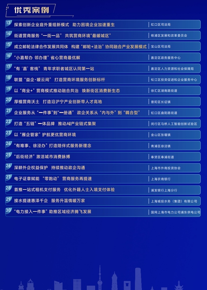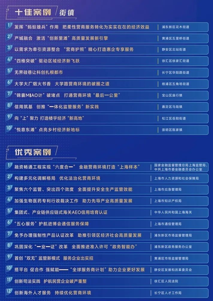 這些案例覆蓋了世行對標改革、為企整體服務、優化涉企監管、夯實基層營商等多個方面,是全市四百余項申報案例中精選出的創新標桿,也是上海營商環境持續優化的全景縮影。
